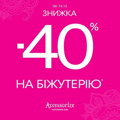 | Описание акции: | Красуні, ви вже готуєтесь до новорічних свят та гарячих вечірок? Саме тому, з 6 по 15 грудня в Accessorize діє знижка -40% на біжутерію! Створюйте ідеальні образи разом з Accessorize ![]() | ||||||
