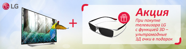 Телевизор в доме – один из способов отвлечься от бытовых вопросов или просто отдохнуть после рабочего дня, а с современными технологиями в новых ТВ, отдых становиться намного качественнее и приятнее. Экономьте не на качестве. Экономьте на цене! Выбирайте акционный телевизор LG и гарантированно получайте 3D очки LG AG-F270 и 3D очки LG AG-F220 к вашему новому телевизору в подарок!