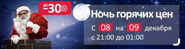 Описание акции: | Ночная распродажа! С 21:00 8 декабря до 1:00 9 декабря на акционные товары будут действовать выгодные скидки до -30%. Спешите, количество акционных товаров ограниченно. ![]() | ||||||