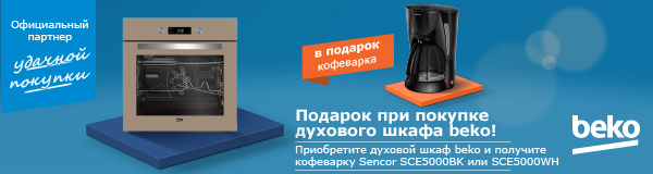 | Описание акции: |  Применение современных технологий, удобство в использовании и элегантность исполнения являются неотъемлемыми качествами духовых шкафов Beko – они смогут стать вам незаменимыми помощниками на кухне, и благодаря дизайну впишутся в любой интерьер. Покупайте акционный духовой шкаф Beko и получайте кофеварку Sencor SCE5000BK в подарок! Акция действует с 18.01.17 по 08.02.17 или пока акционный товар есть в наличии. * Под «Подарком» следует понимать возможность потребителя в рамках акции приобрести указанный акционный товар и "подарок" к нему одним чеком и получить скидку на акционный товар в размере стоимости подарка. В случае расторжения договора купли-продажи акционного товара, потребителю подлежит возврату сумма, что непосредственно им была уплачена за данный товар. Приобретение товара на условиях действующей акции подтверждает ознакомление и согласие потребителя со всеми ее условиями. | ||||||