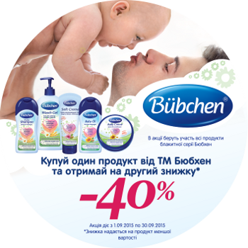 Описание акции: | Сеть детских магазинов "Антошка" и ТМ Bubchen представляют акцию, в период которой Вы получаете скидку - 40% на каждую вторую покупку! В период проведения акции с 1 по 30 сентября при покупке любой позиции из голубой серии ТМ Bubchen на вторую позицию из голубой серии предоставляется скидка 40%. Скидка предоставляется на продукцию меньшей стоимости. ![]() | |