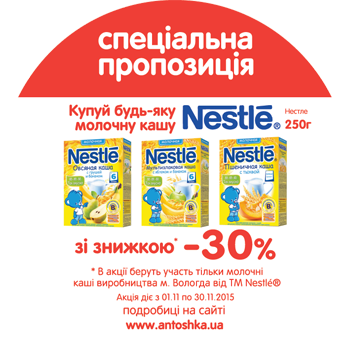 Описание акции: | Сеть детских магазинов "Антошка" и ТМ Nestle представляют скидку 30% на молочные каши данной торговой марки в упаковках объемом 250 гр. Акция действует в период с 1 по 30 ноября 2015 года во всей сети детских магазинов "Антошка"! ![]() | ||||||