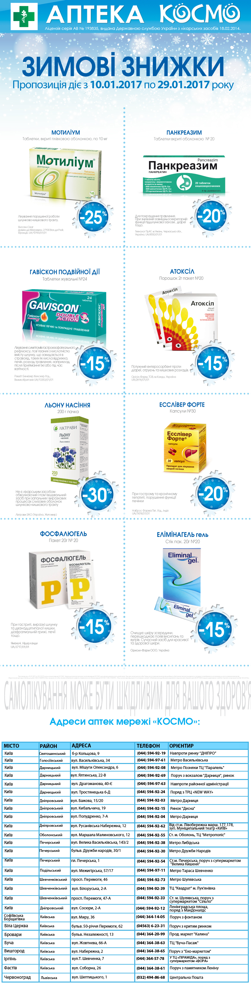 | Описание акции: | Зимові знижки на препарати при розладах роботи шлунково-кишкового тракту![]() | ||||||