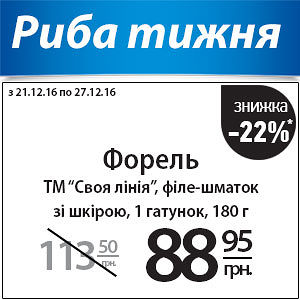 | Описание акции: | Риба та морепродукти є невід’ємною частиною нашого раціону. Адже, окрім ніжних та вишуканих смаків, які роблять наші страви неперевершеними, ці продукти збагачені важливими для здоров’я кожної людини корисними речовинами, вітамінами та мікроелементами. Ми піклуємось про добробут наших покупців! Саме тому, щотижня*, в мережі дискаунтерів АТБ діють знижки на певні позиції з категорії рибної гастрономії та замороженої риби. Конкретний період та актуальну акційну позицію, на яку діє знижка дивіться на цьому рекламному банері або у розділі «Риба тижня». ![]() * Під «щотижня» слід розуміти 7 днів з середи по вівторок включно. Акція діє в магазинах мережі ТОВ «АТБ-маркет» за умови наявності акційного товару. Акційна позиція позначена цінником червоного кольору, оформленого спеціальним рекламним матеріалом з написом «Риба тижня» ТОВ «АТБ-маркет» залишає за собою право змінювати акційні товари і ціни на них в період акції, а також завершити акцію достроково. У разі дострокового завершення акції або внесення змін щодо періоду акції акційного товару, ціни, або відсотка знижки, інформація про це з'явиться на даному сайті не пізніше, ніж за один день до внесення перерахованих вище змін. Розмір знижки на цьому рекламному банері вказано у відповідності з правилами математичного округлення до цілого значення. Детальну інформацію дізнавайтесь за телефоном гарячої лінії 0-800-500-415. Дзвінки зі стаціонарних і мобільних телефонів (Київстар, МТС, Life) на території України безкоштовні. | ||||||