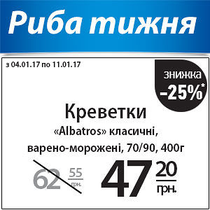 | Описание акции: | Риба та морепродукти є невід’ємною частиною нашого раціону. Адже, окрім ніжних та вишуканих смаків, які роблять наші страви неперевершеними, ці продукти збагачені важливими для здоров’я кожної людини корисними речовинами, вітамінами та мікроелементами. Ми піклуємось про добробут наших покупців! Саме тому, щотижня*, в мережі дискаунтерів АТБ діють знижки на певні позиції з категорії рибної гастрономії та замороженої риби. Конкретний період та актуальну акційну позицію, на яку діє знижка дивіться на цьому рекламному банері або у розділі «Риба тижня». ![]() * Під «щотижня» слід розуміти 7 днів з середи по вівторок включно. Акція діє в магазинах мережі ТОВ «АТБ-маркет» за умови наявності акційного товару. Акційна позиція позначена цінником червоного кольору, оформленого спеціальним рекламним матеріалом з написом «Риба тижня» ТОВ «АТБ-маркет» залишає за собою право змінювати акційні товари і ціни на них в період акції, а також завершити акцію достроково. У разі дострокового завершення акції або внесення змін щодо періоду акції акційного товару, ціни, або відсотка знижки, інформація про це з'явиться на даному сайті не пізніше, ніж за один день до внесення перерахованих вище змін. Розмір знижки на цьому рекламному банері вказано у відповідності з правилами математичного округлення до цілого значення. Детальну інформацію дізнавайтесь за телефоном гарячої лінії 0-800-500-415. Дзвінки зі стаціонарних і мобільних телефонів (Київстар, МТС, Life) на території України безкоштовні. | ||||||