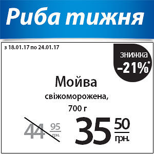 | Описание акции: | Риба та морепродукти є невід’ємною частиною нашого раціону. Адже, окрім ніжних та вишуканих смаків, які роблять наші страви неперевершеними, ці продукти збагачені важливими для здоров’я кожної людини корисними речовинами, вітамінами та мікроелементами. Ми піклуємось про добробут наших покупців! Саме тому, щотижня*, в мережі дискаунтерів АТБ діють знижки на певні позиції з категорії рибної гастрономії та замороженої риби. Конкретний період та актуальну акційну позицію, на яку діє знижка дивіться на цьому рекламному банері або у розділі «Риба тижня». ![]() * Під «щотижня» слід розуміти 7 днів з середи по вівторок включно. Акція діє в магазинах мережі ТОВ «АТБ-маркет» за умови наявності акційного товару. Акційна позиція позначена цінником червоного кольору, оформленого спеціальним рекламним матеріалом з написом «Риба тижня» ТОВ «АТБ-маркет» залишає за собою право змінювати акційні товари і ціни на них в період акції, а також завершити акцію достроково. У разі дострокового завершення акції або внесення змін щодо періоду акції акційного товару, ціни, або відсотка знижки, інформація про це з'явиться на даному сайті не пізніше, ніж за один день до внесення перерахованих вище змін. Розмір знижки на цьому рекламному банері вказано у відповідності з правилами математичного округлення до цілого значення. Детальну інформацію дізнавайтесь за телефоном гарячої лінії 0-800-500-415. Дзвінки зі стаціонарних і мобільних телефонів (Київстар, МТС, Life) на території України безкоштовні. | ||||||