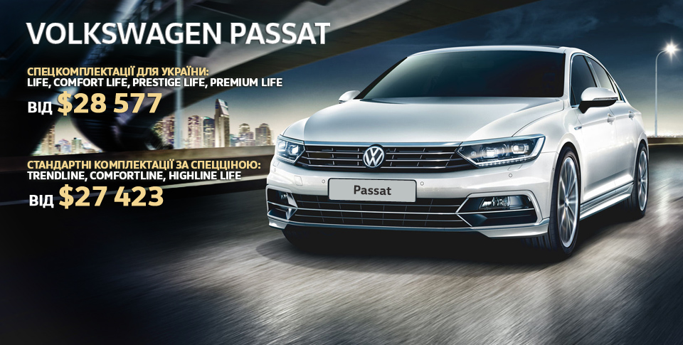 | Описание акции: | Спеціально для України: спецкомплектації Passat за ціною від $27 423!![]() Volkswagen Passat практично відразу після своєї світової прем'єри отримав ряд престижних європейських премій і титулів, наприклад, "GermanDesignAward" в категорії Special Mention за виразність свого дизайну і «Золоте кермо» в номінації «Кращий автомобіль середнього / преміум-класу», а також став переможцем конкурсу «Автомобіль 2015 року в Європі» ("COTY' 2015). В Україні модель так само була відзначають почесною нагородою в традиційному конкурсі "Авто року - 2016", ставши кращим легковим автомобілем середнього класу. У 2017 році Volkswagen надає Вам можливість придбати титуловану модель, безпеку якої гарантована 5-ю зірками в краш-тесті Euro NCAP, в особливих комплектаціях, створених спеціально для України за ціною від $ 27 423! Зробіть покупку, яка буде щодня дарувати Вам комфорт і задоволення в дорозі! Усього розроблено 4 акційні спецкомплектаціі: Life, Comfort Life, Prestige Life і Premium Life і 4 стандартних Trеndline, Comfortline та Highline за спецціною від $ 27 423 (740 421 грн. *). Спецкомплектація Life: ціна від $ 28 577 (771 579 грн. *) За модель з 1.4TSI 150 л.с. SG6 і від $ 32 044 (865 188 грн. *) За модель з 2.0TDI 150 к.с. SG6. Спецкомплектація Comfort Life: ціна від $ 32 612 (880 524 грн. *) За модель з 1.4TSI 150 л.с. SG6 і від $ 33 139 (894 753 грн. *) За модель з 2.0TDI 150 к.с. SG6. Спецкомплектація Prestige Life: ціна від $ 37 062 (1 000 674 грн. *) За модель з 1.4TSI 150 л.с. SG6 і від $ 35 814 (966 978 грн. *) За модель з 2.0TDI 150 к.с. SG6. Спецкомплектація Premium Life: ціна від $ 40 826 (1 102 302 грн. *) За модель з 1.4TSI 150 л.с. SG6 і від $ 39 477 (1 106 879 грн. *) За модель з 2.0TDI 150 к.с. SG6. Устаткування спецкомплектаціі Life: Trendline + додаткові опції: • Парк-пілот: акустичне попередження при наближенні до перешкоди спереду та ззаду (7X2) Асистент дальнього світла "Light Assist": автоматичне перемикання між ближнім і дальнім світлом фар в залежності від зустрічного транспорту (8G1) • Круїз-контроль, вкл. обмежувач швидкості (8T6) • Система фронтального контролю "Front Assist" з функцією екстреного гальмування в міському циклі руху (6K2) • Багатофункціональний 3-х спицеве шкіряне кермо (PM1) • Роз'єм USB, а також для підключення iPod- / iPhone (UI5) • Пакет "Connectivity": роз'єм USB і функція підключення телефону Bluetooth (WDI) • Легкосплавні диски "Aragon" 6,5 J x 16, колеса 215/60 R16 (PJ1) • Металік або чорний перламутр. Кольори бордовий металік "Crimson Red" і білий перламутр "Oryxweiss" за доплату Устаткування спецкомплектаціі Comfort Life: Comfortline + додаткові опції: • Поперекова підтримка передніх сидінь, сидіння водія - з електрорегулюванням вкл. функцію масажу, сидіння переднього пасажира з ручним регулюванням (8I2) • Камера заднього виду "Rear View" (KA2) • Асистент дальнього світла "Light Assist": автоматичне перемикання між ближнім і дальнім світлом фар в залежності від зустрічного транспорту (8G1) • Багатофункціональний кольоровий дисплей "Premium" (9S6) • Мультимедійна система "Composition Media»: 16,5 см (6,5 дюймів) кольоровий ємнісного TFT-дисплей з функцією Touchscreen та сенсором наближення, CD-програвач, 4 х 20 Вт, 8 динаміків, картоприймач SD, роз'єм USB, гніздо AUX -IN, функція підключення телефону Bluetooth, функція JPEG Viewer (ZCE) • Роз'єм USB, а також для підключення iPod- / iPhone, вкл. мультимедійне гніздо AUX-IN (UI4) • App-Connect (9WT) • Металік або чорний перламутр. Кольори бордовий металік "Crimson Red" і білий перламутр "Oryxweiss" за доплату Устаткування спецкомплектаціі Prestige Life: Highline + додаткові опції: • Світлодіодні фари (LED) ближнього і дальнього світла з поворотним світлом і денним світлодіодним світлом, дина