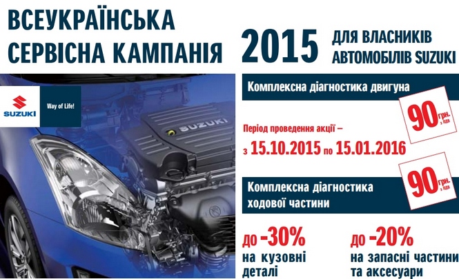 Під час проведення «Всеукраїнської сервісної кампанії SUZUKI — 2015» та за умов проходження акційної діагностики Ви матимете можливість отримати наступні додаткові переваги: