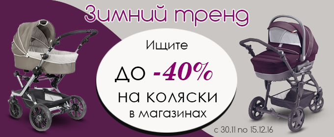 | Описание акции: | Зимний тренд!!! С 30.11 по 15.12.16 до -40% на коляски в магазинах BABYZONE!!! Детали в магазинах. ![]() | ||||||