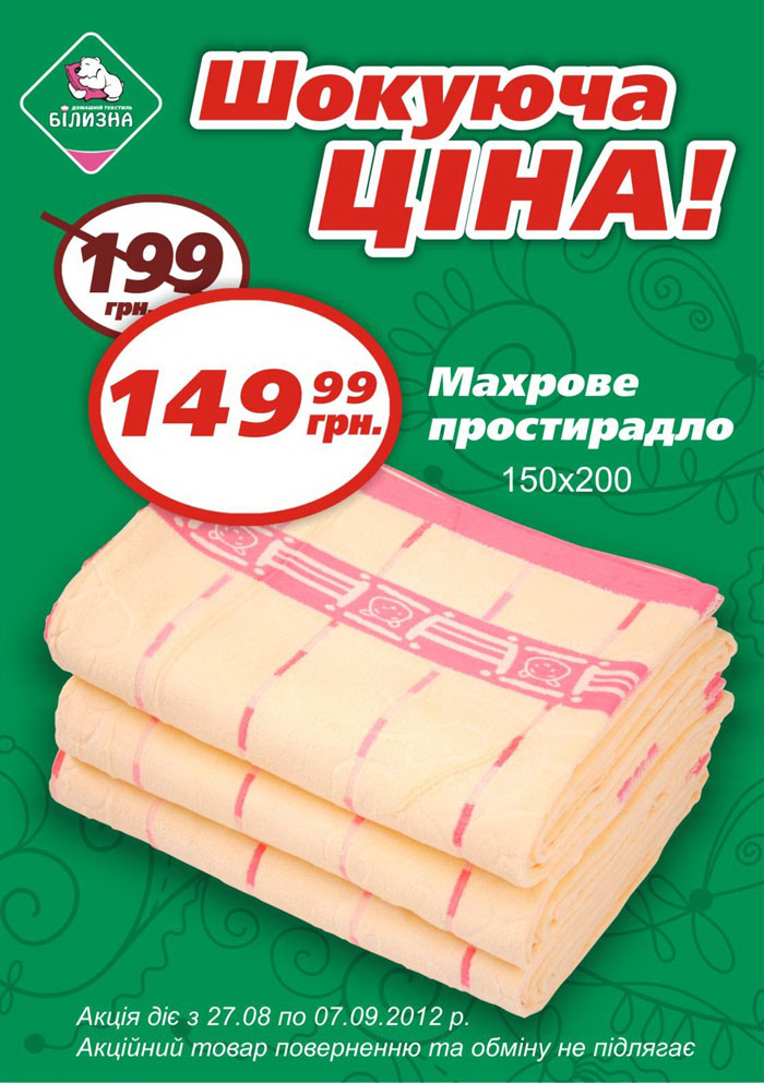Описание акции: | Шокуюча ціна! Махрове простирадло 150х200 - 149,99грн. ![]() | ||||||