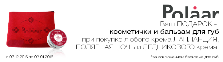 Описание акции: | При покупке одного любого крема Лапландия (кроме бальзама для губ),Ледникового крема, крема "Полярная ночь" - косметичка красная и бальзам для губ Лапландия в подарок.![]() | ||||||