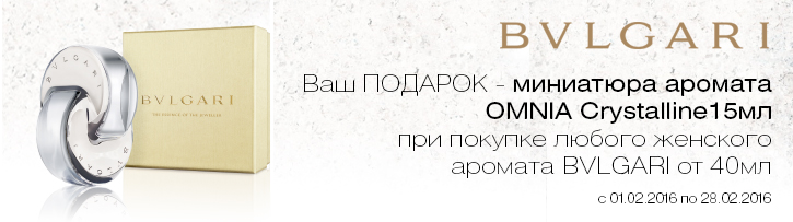 Описание акции: | Миниатюра туалетной воды Omnia Crystalline в подарок! С покупкой любого женского аромата Bvlgari от 40 мл.![]() | ||||||