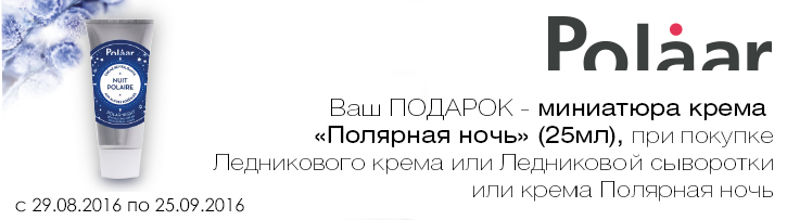 Описание акции: | При покупке одного любого продукта Ледникового крема, Ледниковой сыворотки, крема Полярная ночь - миниатюра крема "полярная ночь" в подарок ![]() | ||||||