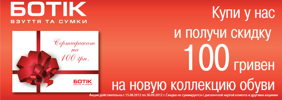Описание акции: | Акция! Купи у нас и получи скидку 100 грн. на новую коллекцию обуви. ![]() | ||||||