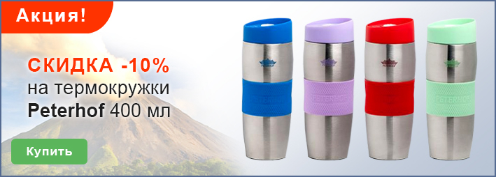 | Описание акции: | ![]() Скидка -10% на термокружки Peterhof 400 мл! Термокружки изготовлены из качественной нержавеющей стали с двойными стенками, что обеспечивает отличную теплоизоляцию. | ||||||