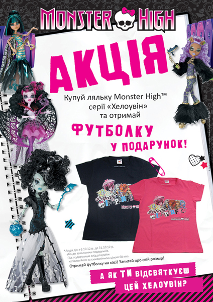 Описание акции: | Замечательная акция для фанаток кукол серии Monster High! При покупке куклы из серии «Хелоувин» получи футболку в подарок!* ![]() В акции принимают участие артикула из новой серии «Хеллоувин»: 1. арт.Х3714, Кукла Френки из серии «Хелоувин» 2. арт.Х3715, Кукла Клодин из серии «Хелоувин» 3. арт.Х3716, Кукла Дракулора из серии «Хелоувин» 4. арт.Х3718 , Кукла Клео из серии «Хелоувин» ![]() Спроси футболку своего размера на кассе! В наличии представлены следующие размеры футболок: 7-8 (на рост 128 см.) 9-10 (на рост 140 см.) 12-13 (на рост 152 см.) * Под подарком необходимо подразумевать покупку футболки по символической цене 60 коп. Торопитесь! Количество подарков ограниченно! | ||||||