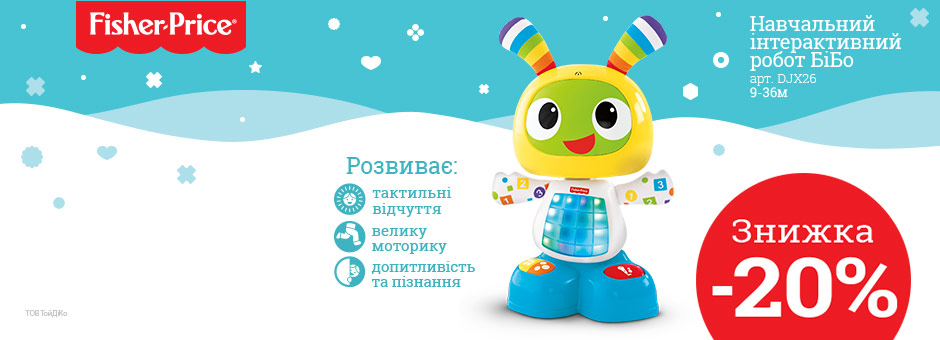 | Описание акции: | Ваш футуристический друг, умеет петь, танцевать и учить! Только с 26.11.2016 г. до 15.01.2017 г. скидка -20% на Интерактивного работа Бибо. ![]() Скидка не суммируется со скидкой дисконтной карты "Будинок іграшок", однако сумма зачисляется на дисконтную карту. | ||||||