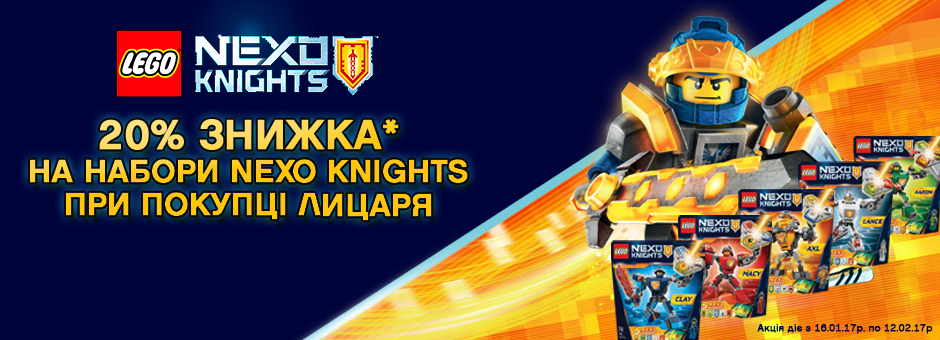 | Описание акции: | Скидки 20% на LEGO Nexo Knights![]() Собирай свою команду рыцарей и защищай королевство от зла! Любимые герои, мощное оружие и настоящая дружба - команда победителей! Купи любого* рыцаря и получи купон на скидку 20% на следующую покупку 1-го из наборов LEGO NEXO KNIGHTS**. Акция действует во всех магазинах "Будинок Іграшок" и в интернет-магазине "Будинок Іграшок". При покупке нескольких наборов рыцарей - получите несколько купонов. За каждого 1 рыцаря по 1 купону. 1 купон дает скидку на 1 набор. *Перечень акционных артикулов: 70362, 70363, 70364, 70365, 70366. **Перечень наборов на которые будет действовать скидка: 70310, 70311, 70312, 70313, 70314, 70315, 70316, 70317, 70318, 70319, 70320, 70321, 70322, 70323, 70324, 70325, 70326, 70327, 70330, 70331, 70332 , 70333, 70334, 70335, 70336, 70337, 70338, 70339, 70347, 70348, 70349, 70350, 70351, 70352, 70358, 70359, 70362, 70363, 70364, 70365, 70366, 70372. Скидка по купону не суммируется с действующими акциями сети "Будинок Іграшок". Скидка не суммируется со скидкой дисконтной карты "Будинок Іграшок", однако сумма зачисляется на дисконтную карту. | ||||||