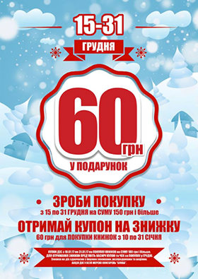 | Описание акции: | Друзі, до новорічних свят "Буква" дарує 60 грн.! Зроби покупку з 15 по 31 грудня на суму 150 грн. і більше отримай купон на знижку 60 грн. на покупку книжок у січні. ![]() *дізнавайтеся деталі акції у консультантів мережі книгарень | ||||||
