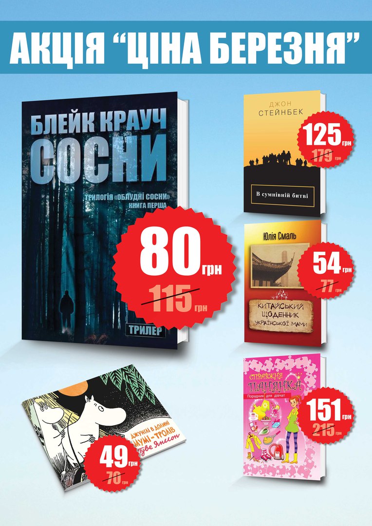 | Описание акции: | ![]() Завітайте до книгарні "Буква"! СПЕЦІАЛЬНА ЦІНА У БЕРЕЗНІ НА КНИЖКИ: - Сосни. Книга 1 (Блейк Крауч) - Джунглі в долині Мумі-Тролів (Туве Янссон) - В сумнівній битві (Джон Стейнбек) - Китайський щоденник української мами (Юлія Смаль) - Справжня панянка. Порадник для дівчат Книгарня "Буква" ТРЦ Dream Town 1 (3-й поверх, атріум Греція) | ||||||