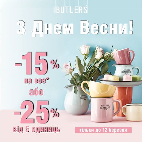 | Описание акции: | ![]() BUTLERS вітає Вас зі святом Весни та дарує -15% на ВСЕ або -25% на чек від 5 одиниць до 12 березня. Бажаємо квітучого настрoю та приємних вражень разом з BUTLERS! | ||||||