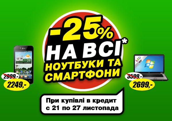 Описание акции: | ![]() Только с 21 по 27 ноября -25% на все* ноутбуки и смартфоны при покупке в кредит! * - в акции НЕ принимают участие специальные предложения **, товары приобретенные в рассрочку и акционный кредит. за исключением: ноутбук HP Pavilion g6-1202sr, смартфон LG P 970 Optimus | ||||||