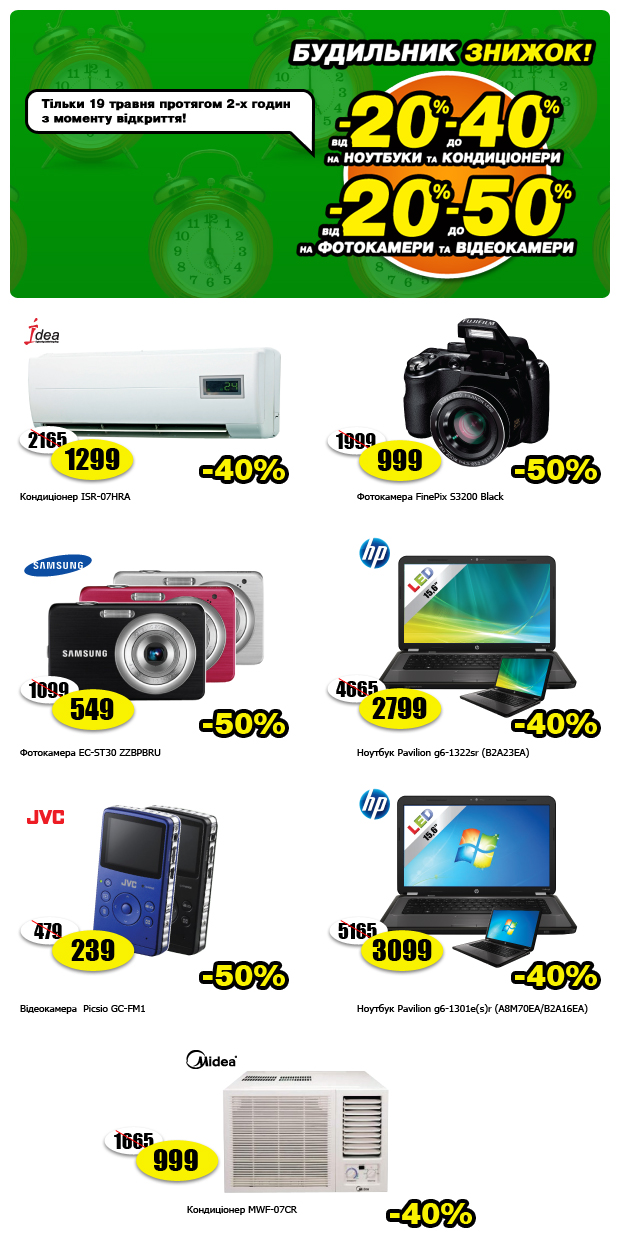 Описание акции: | Будильник знижок! Лише один день, 19 травня! Знижки 20-40% на ноутбуки та кондиціонери, знижки 20-50 на фотокамери та відеокамери. ![]() | ||||||