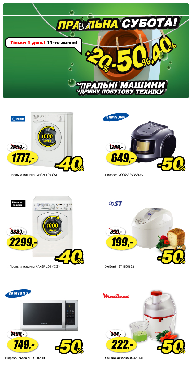 Описание акции: | Пральна субота у Comfy! Тільки 14 липня! 20%-50% на пральні машини та дрібну побутову техніку! ![]() | ||||||