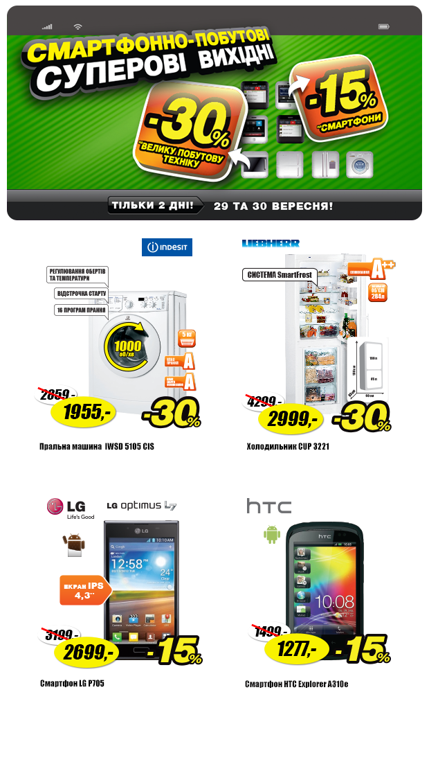 Описание акции: | Смартфонно-побутові суперові вихідні! Знижка 30% на велику побутову техніку, знижка 15% на смартфони! ![]() | ||||||