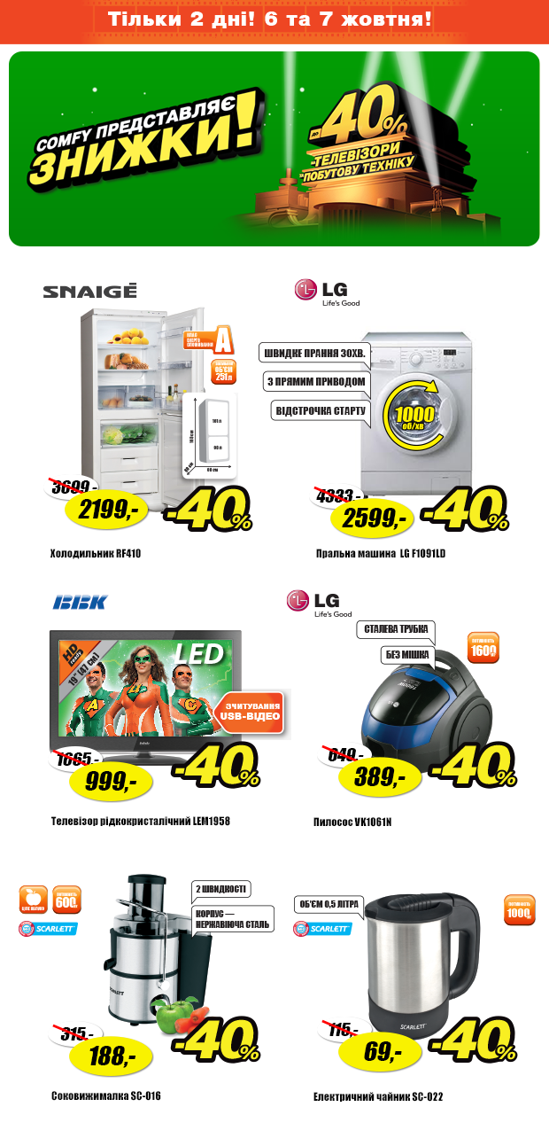 Описание акции: | Тільки два дні! На телевізори і побутову техніку знижка 40% ![]() | ||||||