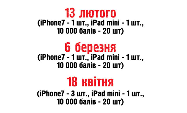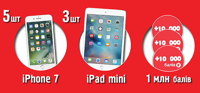 | Описание акции: | Купуйте з карткою Fishka та беріть участь у розіграші* iPhone 7 або iPad mini та 10 000 балівFishka на вашу картку. Кожні 150 грн в чеку – це один шанс на виграш. Більше покупок – більше шансів! ![]() Розіграш головних призів до Дня закоханих, Жіночого свята та Пасхи відбудеться: ![]() Окрім того, щопонеділка на всіх учасників чекатиме розіграш 5 подарунків по 10 000 балів Fishka. Акція діє з 30.01.2017 р. по 16.04.2017 р. в усіх магазинах «Фуршет». Офіційні правила акції. Акція діє на всій території України, за винятком АР Крим та територій проведення антитерористичної операції , у всіх діючих супермаркетах «Фуршет» та «Гурман-Фуршет». Для участі в Акції необхідно здійснити покупку на суму від 150 грн з ПДВ одним чеком з карткою Fishka. В суму чеку не враховується вартість придбаних тютюнових виробів та подарункових сертифікатів. Офіційні правила Акції – на сайтах furshet.ua, myfishka.com й за телефоном 0 800 505 118. * Йдеться про можливість стати одним із переможців Акції, які отримають право придбати один із подарунків-товарів, перелік яких визначено в Офіційних правилах Акції як Головні винагороди, за ціною 0,05 грн з ПДВ та/або 10 тис. балів на зареєстрований рахунок Fishka. Порядок визначення переможців Акції, результати визначення переможців Акції та порядок отримання винагород Акції – згідно з Офіційними правилами Акції (за телефоном 0 800 505 118, на сайті myfishka.com або furshet.ua). | ||||||