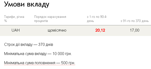 Описание акции: | Акційна пропозиція — «Найкращий-2012» Депозит «Найкращий-2012» — акційний депозит в гривні із підвищеним розміром процентної ставки. Увага! Дія акційної пропозиції подовжена до 31.01.2012 р.(включно). Додаткові переваги: - пільгові умови дострокового розірвання вкладу - можливість поповнення вкладу - щомісячне отримання процентів - можливість змінити валюту вкладу в будь-який момент дії договору без втрати раніше нарахованих процентів — унікальна пропозиція на фінансовому ринку України - можливість отримати безкоштовно VIP-картку за тарифом «Золотий Гаманець Депозит» при розміщенні вкладу від 100 000 грн. на термін від 6 місяців ![]() | ||||||