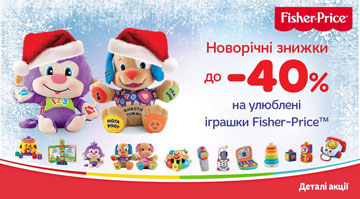 С 01.12.2105 по 31.12.2015 в универмаге Детский мир проходит Новогодняя акция с 40% скидкой на детские игрушки* торговой марки Fisher-price.