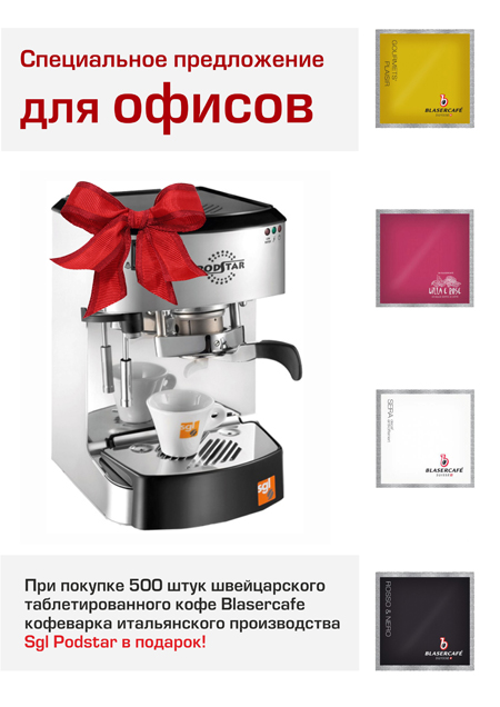 Описание акции: | При покупке 500 штук швейцарского таблетированного кофе Blasercafe кофеварка итальянского производства Sgl Podstar в подарок!![]() | ||||||