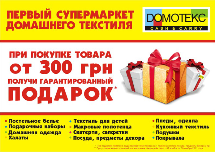 Описание акции: | АКЦИЯ! «Получи гарантированный подарок» в сети супермаркетов домашнего текстиля DOMOTEKC. ![]() Об условиях акции спрашивайте в магазинах Домотекс. | ||||||