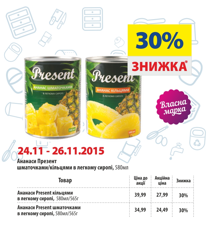 Описание акции: | На консервовані ананаси шматочками - знижка 30%!![]() | ||||||