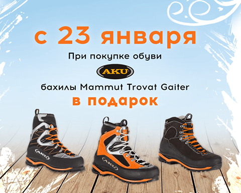 | Описание акции: | ![]() С 23 января у нас действует акция: покупая ботинки AKU, получаете бахилы Mammut Trovat Gaiter в подарок. Акция распространяется на все модели альпинистской линейки: Ботинки AKU Serai GTX Ботинки AKU Terrealte GTX А также: Ботинки AKU Superalp GTX Ботинки AKU Superalp NBK GTX Ботинки AKU Superalp NBK LTR При условии покупки обуви по розничной цене | ||||||