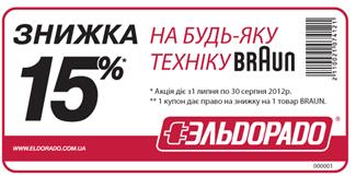 Описание акции: | Сеть бытовой техники и электроники «Эльдорадо» объявляет о начале скидок! Приходите в магазин в период с 7 июля по 31 августа 2012 года предъявляйте купон со штрихкодом, полученный при покупке хоз. продукции и получай скидку в размере 15% на всю продукцию ТМ Braun.![]() Правила проведения акции уточняйте в розничных сетях магазинов «Эльдорадо». Или по телефону горячей линии 080 030-00-30. | ||||||