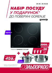 Описание акции: | Только в сети магазинов бытовой техники и электроники «Эльдорадо», а также в интернет-магазине в период с 2 по 31 октября 2012 года, у Вас есть возможность купить электрическую поверхность ТМ GORENJE и получить в *подарок идеальный набор посуды для Вашей кухни GORENJE CW 3 SC. *Под подарком подразумевается покупка товара за 1 гривну. Акция действует во все виды кредита, в том числе и беспроцентные! Спешите, количество товаров ограниченно! ![]() | ||||||