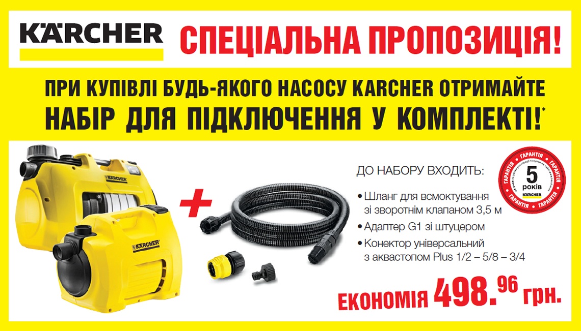 Описание акции: | *мається на увазі придбання набору для підключення за 0,96 грн. з ПДВ. Організатор пропозиції ТОВ «Керхер». Роздрібна вартість набору для підключення 498,96 грн. (арт. 10212633) Додаткові 48 місяців гарантійного обслуговування клієнт отримує за умови реєстрації покупки на сайті: www.karcher.ua ![]() | ||||||