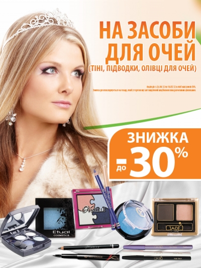 Описание акции: | НА ЗАСОБИ ДЛЯ ОЧЕЙ (ТІНІ, ПІДВОДКИ, ОЛІВЦІ ДЛЯ ОЧЕЙ) Знижка до 30%![]() Акція діє з 26.04.12 по 16.05.12 в лінії магазинів EVA. Знижка розповсюджується на товар, який у торговому залі виділений акційними помаранчевими цінниками. | ||||||
