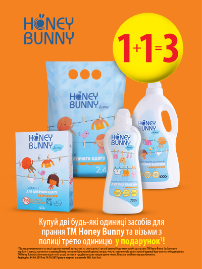 1+1=3! Купуй дві будь-які одиниці засобів для прання ТМ Honey Bunny та візьми з полиці третю одиницю у подарунок.