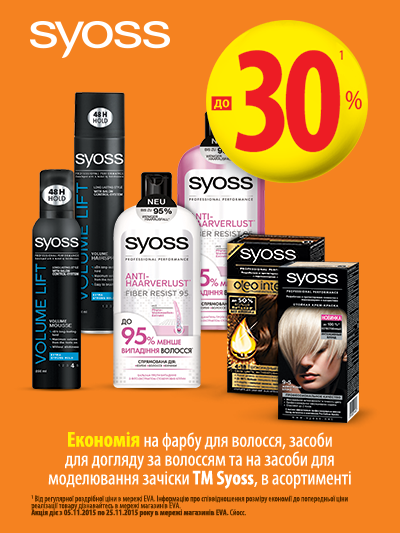 Описание акции: | Економія до 30% на фарбу для волосся, засоби для догляду за волоссям та на засоби для моделювання зачіски ТМ Syoss, в асортименті.![]() | ||||||