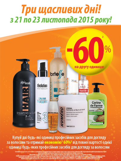 Описание акции: | На другу одиницю професіних засобів для догляду за волоссям - знижка 60%!![]() | ||||||