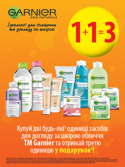 1+1=3! Купуй дві будь-які¹ одиниці засобів для догляду за шкірою обличчя ТМ Garnier та отримай третю одиницю у подарунок.