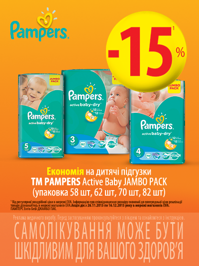 Економія 15% на дитячі підгузки ТМ Pampers Active Baby Jambo Pack (упаковка 58 шт., 62 шт., 70 шт., 82 шт.). ![]() | ||||||