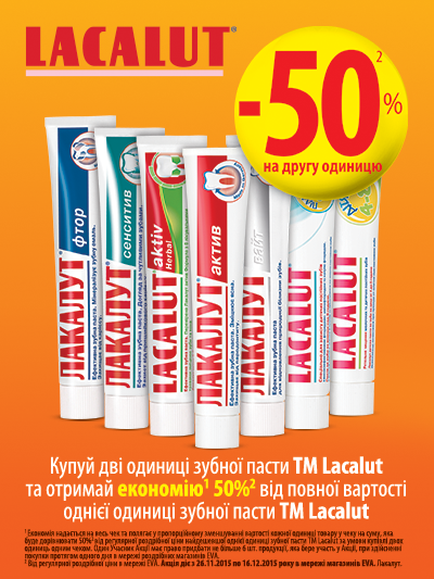 Економія 50% на другу одиницю! Купуй дві одиниці зубної пасти ТМ Lacalut та отримай економію 50% від повної вартості однієї одиниці зубної пасти ТМ Lacalut. ![]() | ||||||
