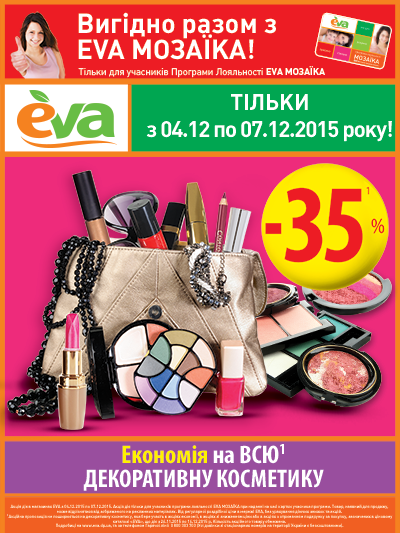 Акція діє тільки для учасників програми лояльності EVA МОЗАЇКА при наданні на касі картки учасника програми. Товар, наявний для продажу, може відрізнятися від зображеного на рекламних матеріалах.