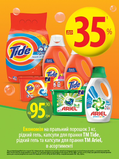Вигідна ціна — від 95,90 грн! Економія до 35% на пральний порошок 3 кг, рідкий гель, капсули для прання ТМ Tide, рідкий гель та капсули для прання ТМ Ariel, в асортименті. ![]() | ||||||