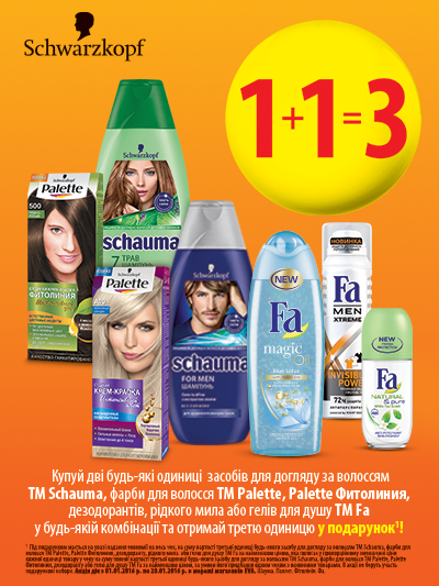 1+1=3! Купуй дві будь–які одиниці засобів для догляду за волоссям ТМ Schauma, фарби для волосся ТМ Palette, Palette Фітолінія, дезодорантів, рідкого мила або гелів для душу ТМ Fa у будь–якій комбінації та отримай третю одиницю у подарунок. ![]() | ||||||